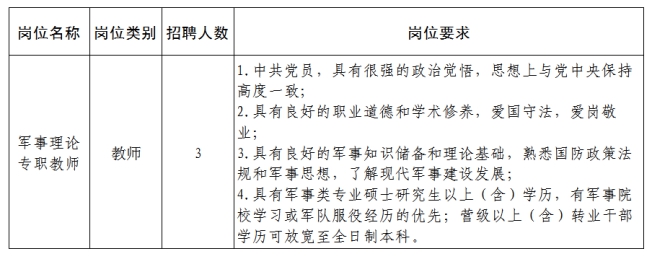 因工作需要,武装部军事课教研室校内招聘军事理论课程专职教师3名。现将有关事项公告如下: