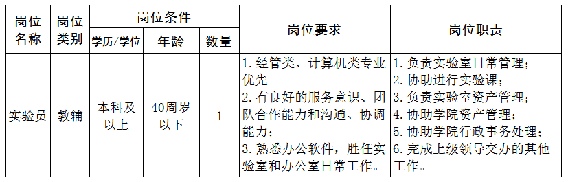 根据学校工作部署,现面向校内招聘经济与管理学院实验员1名,有关事项公告如下: