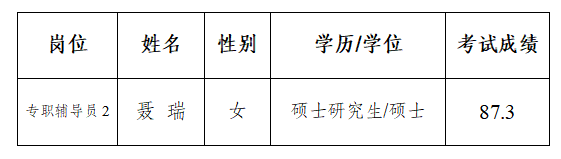 根据《sunbet官网2020年下半年全日制聘用专职辅导员招聘公告》的相关要求,经过报名、资格审查、考试、体检及考察环节,聂瑞确定为全日制专职辅导员拟聘用人选,现予以公示,公示名单如下:
