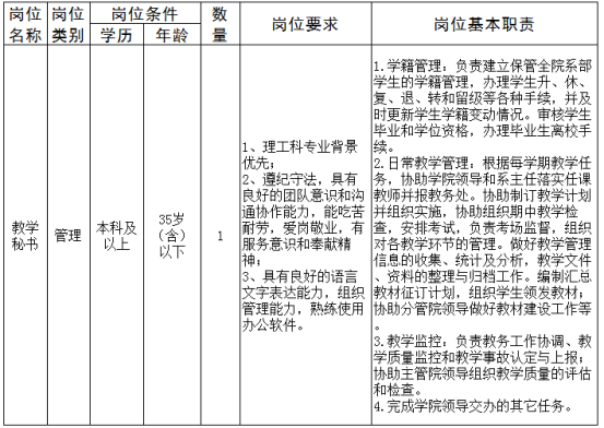 根据学校工作部署,现面向校内招聘教学秘书岗位1名,有关事项公告如下:
