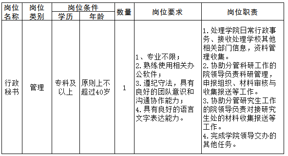 根据学校工作部署,现面向校内招聘行政秘书岗位,有关事项公告如下: