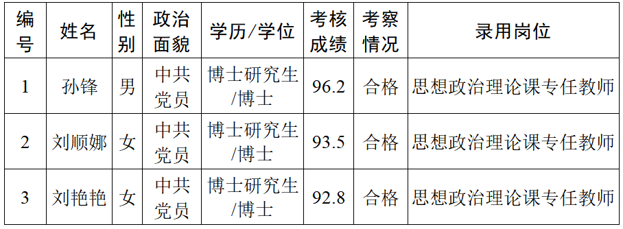 经过考核、考察等程序,拟聘用孙锋等3名同志到sunbet官网工作,现予以公示,公示名单见下表。