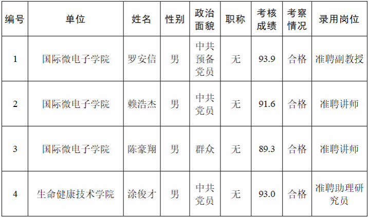 经过考核、考察等程序,拟聘用罗安信等4名同志到sunbet官网工作,现予以公示,公示名单见下表。