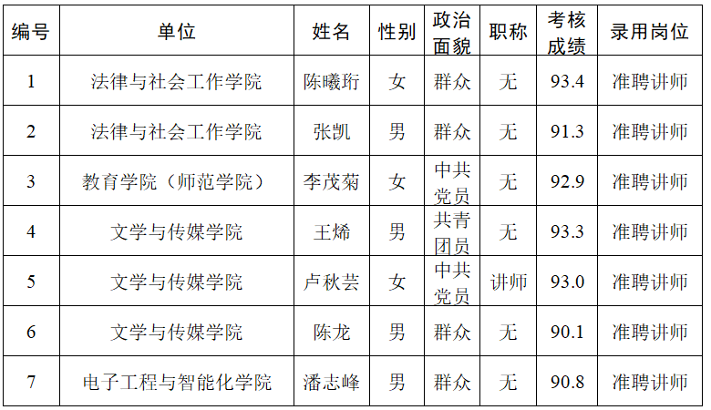 经过考核、考察等程序,拟聘用陈曦珩等7名同志到sunbet官网工作,现予以公示,公示名单见下表。