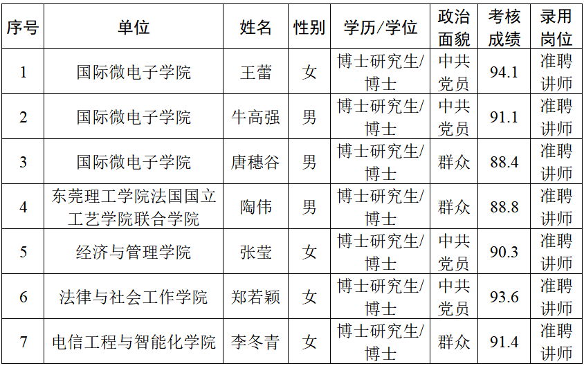 经过考核、考察等程序,拟聘用王蕾等7名同志到sunbet官网工作,现予以公示,公示名单见下表。