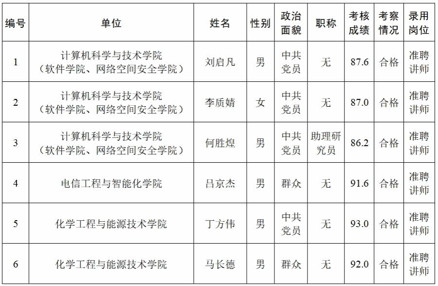 经过考核、考察等程序,拟聘用刘启凡等6名同志到sunbet官网工作,现予以公示,公示名单见下表。