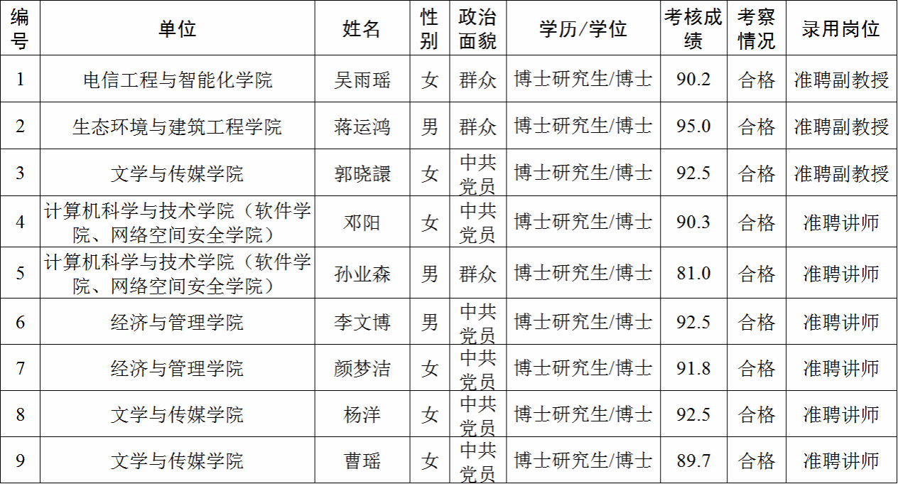 经过考核、考察等程序,拟聘用吴雨瑶等9名同志到sunbet官网工作。现予以公示,公示名单见下表。