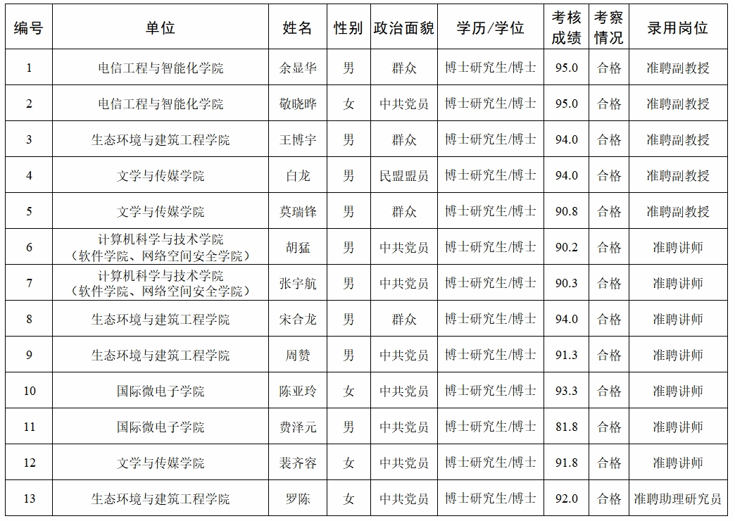 经过考核、考察等程序,拟聘用余显华等13名同志到sunbet官网工作。现予以公示,公示名单见下表。
