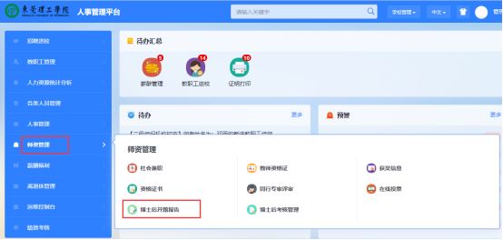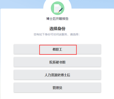 2、登录系统后,点击左侧的【师资管理】的【博士后开题报告】,选择教职工角色进入系统。
