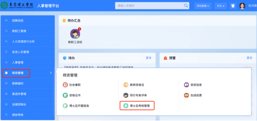2、登录系统后,点击左侧的【师资管理】的【博士后考核管理】,选择教职工角色进入系统。
