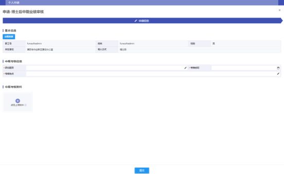 博士后点击【博士后中期业绩审核】选项,进入界面后,核对个人基本信息,并填写中期考核信息的研究题目、考核时间(预计时间)和地点,点击上传附件按钮上传《博士后业绩成果登记表》以及相关佐证附件材料(论文、专利、项目等),确认无误点击提交按钮。