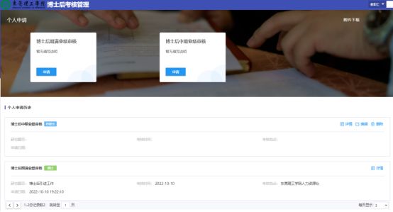 3、进入系统后,显示个人申请页面,有【博士后中期业绩审核】、【博士后期满业绩审核】两个选项,右上角有一个附件《博士后业绩成果登记表》提供下载,或在人资部博士后sunbet板块下载(下载:sunbet官网博士后业绩成果登记表-人力资源部 - sunbet官网)。个人下载《博士后业绩成果登记表》,填写相应的业绩并保存,选择对应业绩审核方式进行申请。