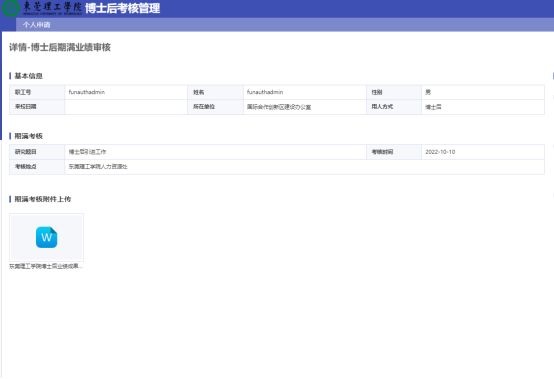 博士后点击【博士后期满业绩审核】选项,进入界面后,核对个人基本信息,并填写期满考核信息的研究题目、考核时间(预计时间)和地点,点击附件上传按钮上传《博士后业绩成果登记表》以及相关佐证附件材料(论文、专利、项目等),确认无误点击提交按钮。