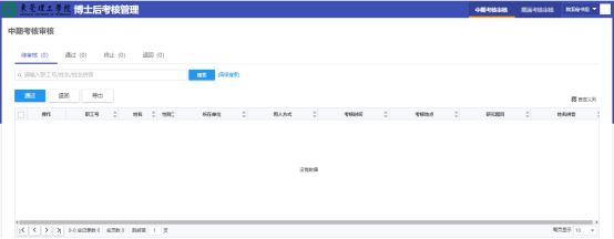 个人提交后,需各二级组织机构院办秘书组人员对博士后的开题、中期、出站业绩进行审核。各二级组织机构院办秘书组人员登录系统查看界面,可以查阅待审核、通过、终止以及退回的相关详情。